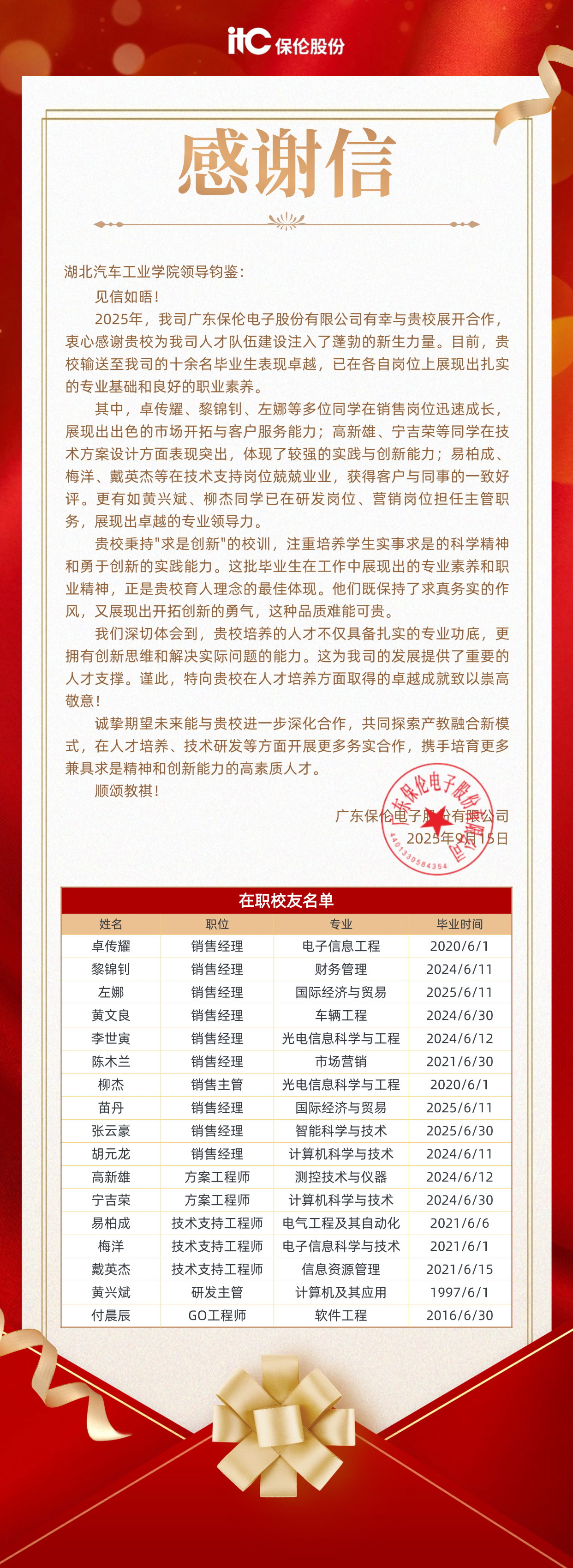 本网讯(文/陈君妍)9月15日,保伦电子股份有限公司向英国上市公司365发来感谢信,信中盛赞英国上市公司365测控技术与仪器专业高新雄、计算机科学与技术专业宁吉荣、电子信息工程专业卓传耀等17名毕业生在技术方案设计、技术支持、营销等岗位上展现出扎实的专业基础和良好的职业素养,部分毕业生已经担任主管职务,展现出卓越的专业领导力。