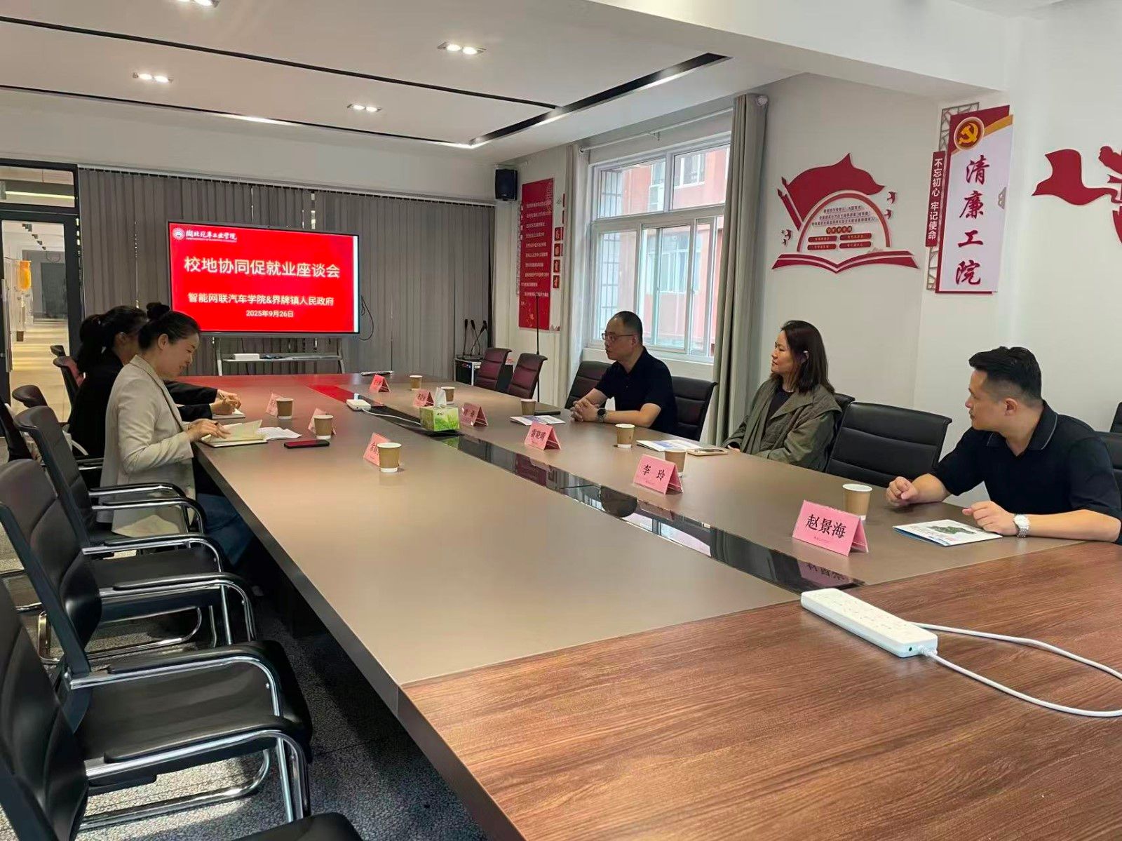 与此同时,在学院办公楼会议室同步举行了深化校地合作、共促就业的座谈会。界牌镇党委书记刘奇在会上介绍了当地产业发展现状、人才政策及企业用人需求,并表达了与学校建立长期合作关系的愿望,吸引更多优秀毕业生到界牌镇就业创业,为地方经济发展注入人才活力。