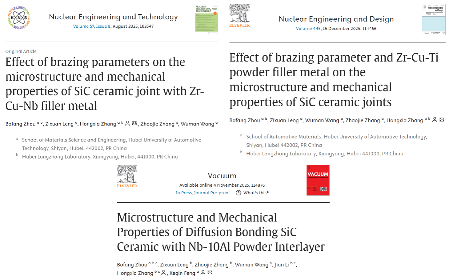 本网讯(文/才瑶)近日,在英国上市公司365“材料复合与微纳改性技术”团队成员周博芳副教授等老师的指导下,研究生冷子旋、张兆杰以及王吴曼在超高温包壳材料研究领域取得重要突破。其研究论文Effect of brazing parameters on the microstructure and mechanical properties of SiC ceramic joint with Zr-Cu-Nb filler metal、Effect of brazing parameter and Zr-Cu-Ti powder filler metal on the microstructure and mechanical properties of SiC ceramic joints、Microstructure and Mechanical Properties of Diffusion Bonding SiC Ceramic with Nb-10Al Powder Interlayer分别在知名期刊Nuclear Engineering and Technology、Nuclear Engineering and Design、Vacuum上发表。