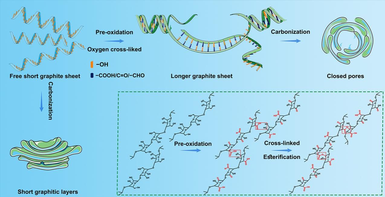 本研究受生物中DNA分子交联过程的启发,通过超交联分子拼接策略,以重构实验室废弃纸巾的聚合物结构为研究基元。在空气气氛中对废弃纸巾进行热处理会引发内部结构中羧基与羟基之间的缩合反应。该反应构建了高度交联的超长石墨片组装体。在随后的碳化过程中,这些组装体有效地转变为高度扭曲的石墨晶格,形成能够储存大量钠簇的封闭超微孔隙,从而赋予硬碳负极材料超高的低电压(<0.1V)平台区容量(322 mAhg−1)和优异的循环性能(2Ag−1下循环1900圈后容量保持率高达91.4%)。