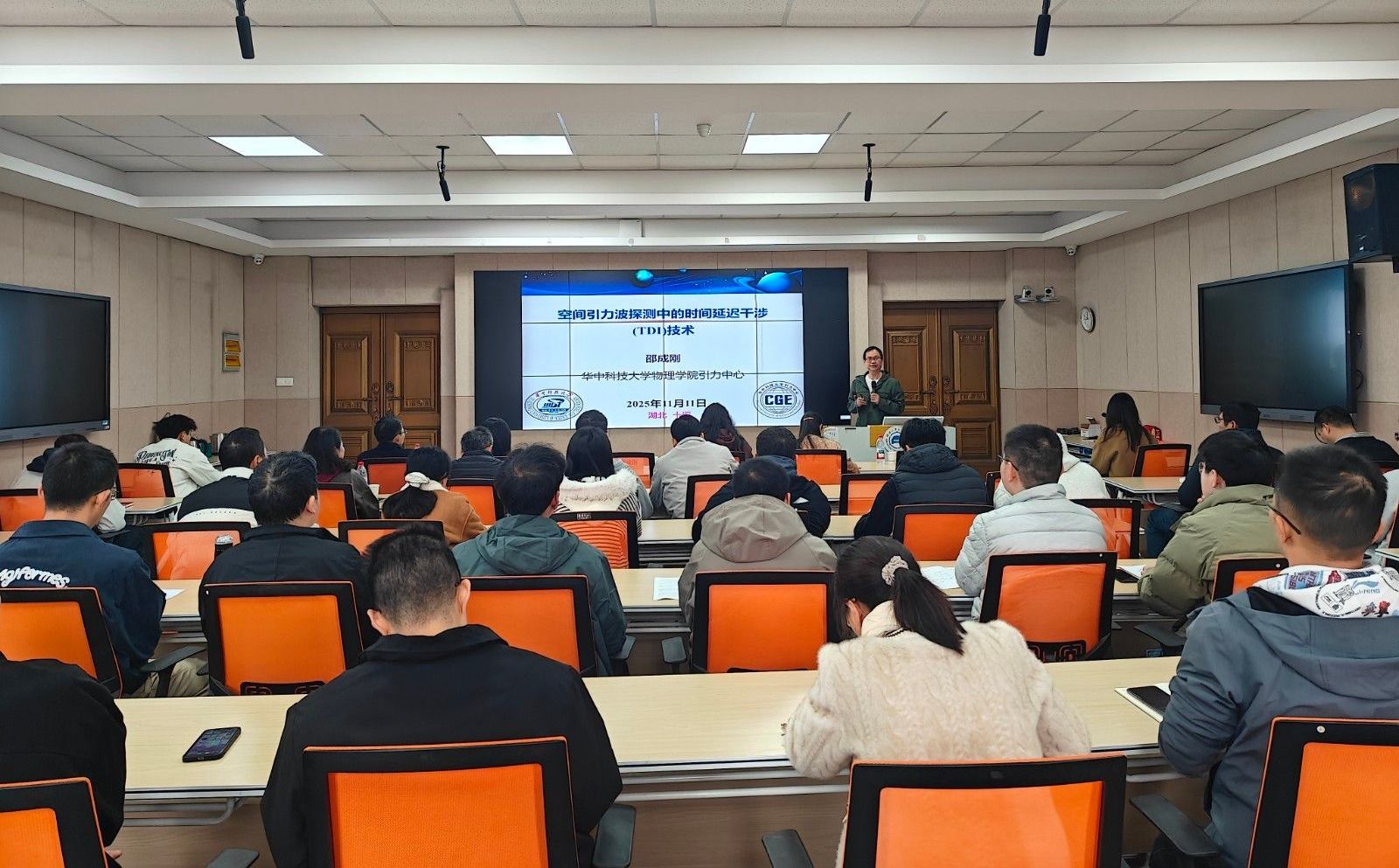 本网讯(文/杨正新、吴晴)11月11日上午,华中科技大学物理学院、国家杰出青年科学基金项目获得者邵成刚教授应邀做客学校“东风讲坛”第一百五十七讲,作了题为“空间引力波探测中的时间延迟干涉技术”的学术报告。光电工程学院、新能源学院领导班子,学院骨干教师、全体研究生及其他学院感兴趣的师生参加了此次报告会,报告会由学院副院长马亚楠主持。