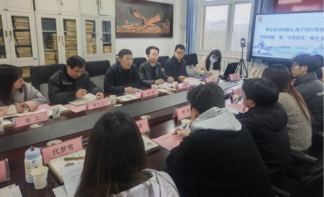 本网讯(文/图 王净杰)11月17日下午,人工智能学院“学海领航”暨“与青拾光”师生廉洁主题交流会在S6521会议室举行。校纪委副书记孙峰、图书馆党支部书记陈战锋、组织部副部长李亚洲,以及人工智能学院党委书记林飞飞、党委副书记曾又等领导老师参加活动。校院两级领导干部与结对学生及党员代表围坐对话,共织“廉”画、共沐“清”风,打造了一堂走心又走“新”的廉洁思政课。