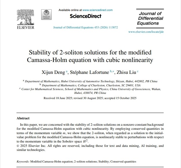 本网讯(文/李保林)近日,数字经济学院微分方程科研团队在国际知名数学学术期刊Journal of Differential Equations发表论文Stability of 2-soliton solutions for the modified Camassa-Holm equation with cubic nonlinearity。