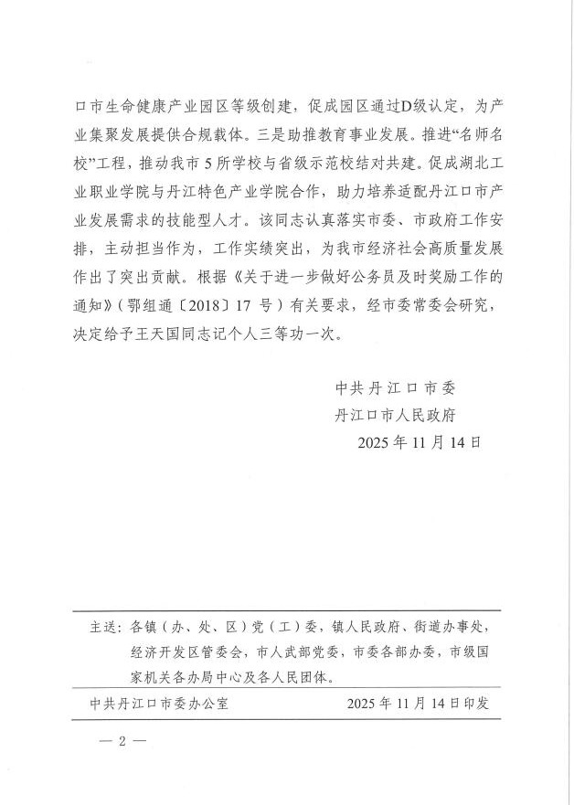 王天国同志此次获表彰,充分体现了学校干部队伍较强的专业素养和实干担当精神。学校将持续完善挂职工作机制,鼓励更多干部教师主动融入区域发展大局,在实践锻炼中提升能力、贡献力量,为湖北加快建成中部地区崛起重要战略支点、十堰建设鄂西区域中心城市作出更大贡献。(审稿 王镇)