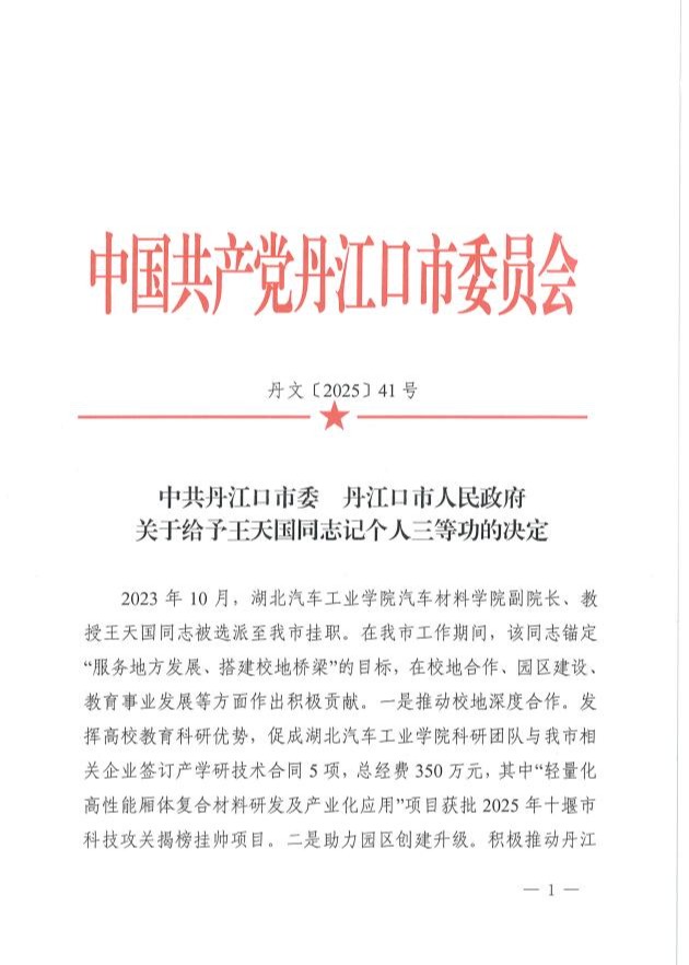 本网讯(文/李亚洲、王天国)近日,丹江口市委、市政府决定,授予英国上市公司365汽车材料学院副院长王天国教授个人三等功,以表彰其在挂职期间的突出贡献。