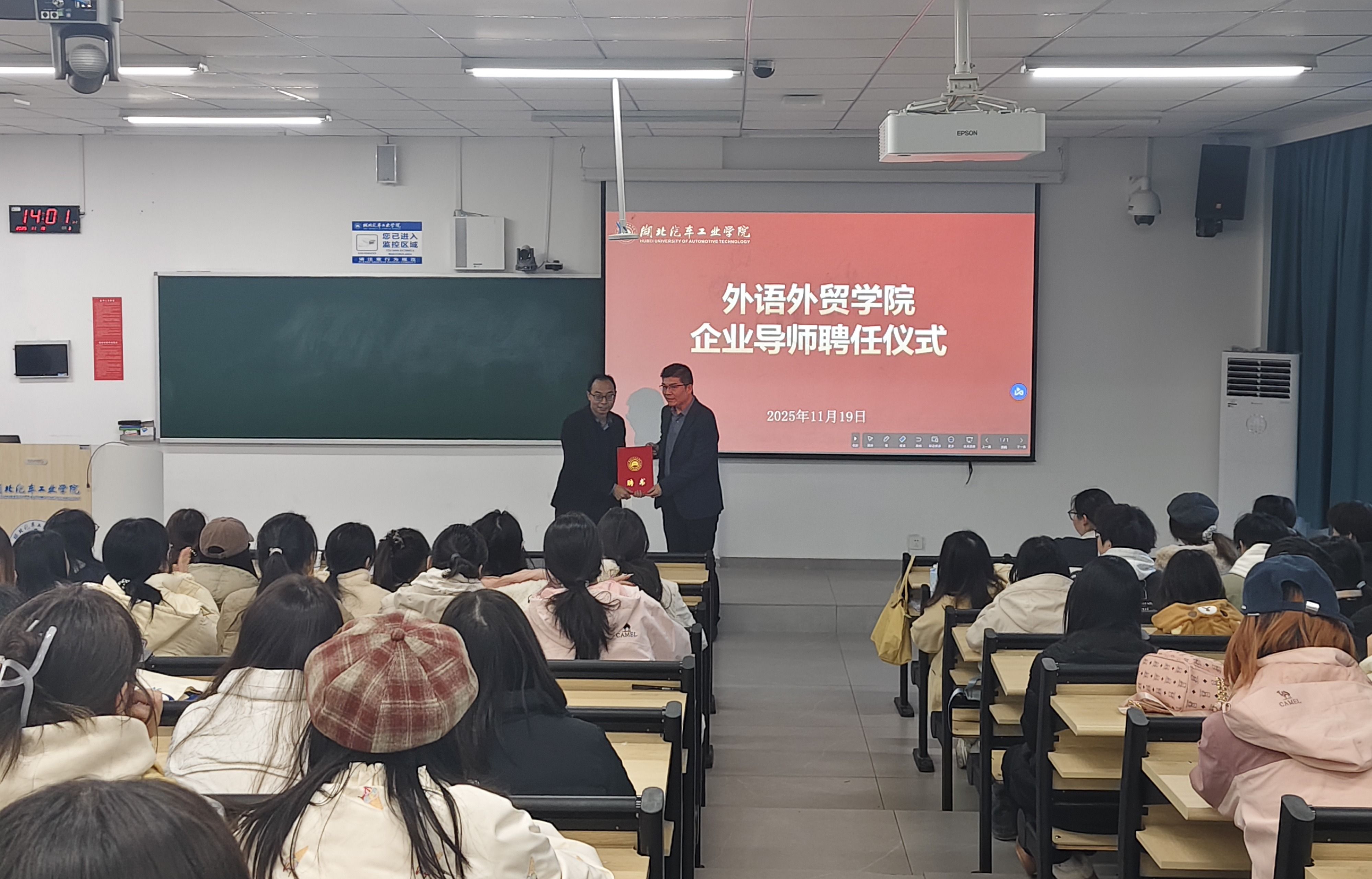 本网讯(文/曹珍珠)为充分发挥校外导师在协同育人中的重要作用,护航学生成长成才,11月19日下午,外语外贸学院在8310教室举办企业导师聘任仪式,觅亿(上海)汽车科技有限公司执行董事兼总经理刘鹏受聘为学院企业导师。院长杨荣广、副院长翟全伟、专业老师代表、辅导员及两百余名学生参加活动。