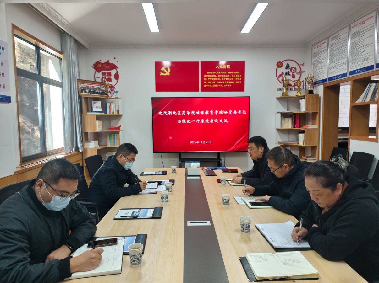 上午,湖北医药学院继续教育学院党委书记汤俊波一行到访。缪勇介绍学院发展历程与办学特色,双方聚焦招生管理、教学改革、师资建设、校企合作等核心议题,探讨破解发展瓶颈、提升人才培养质量的路径。汤俊波高度认可学院办学成效,期待加强联动共享。