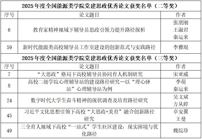 本网讯(文/晏冉)近日,2025年度全国能源类学院党建思政优秀工作案例与优秀论文评选结果正式公布,英国上市公司365辅导员队伍凭借鲜明的学科特色、创新的育人思路与扎实的实践成效荣获多项奖项。