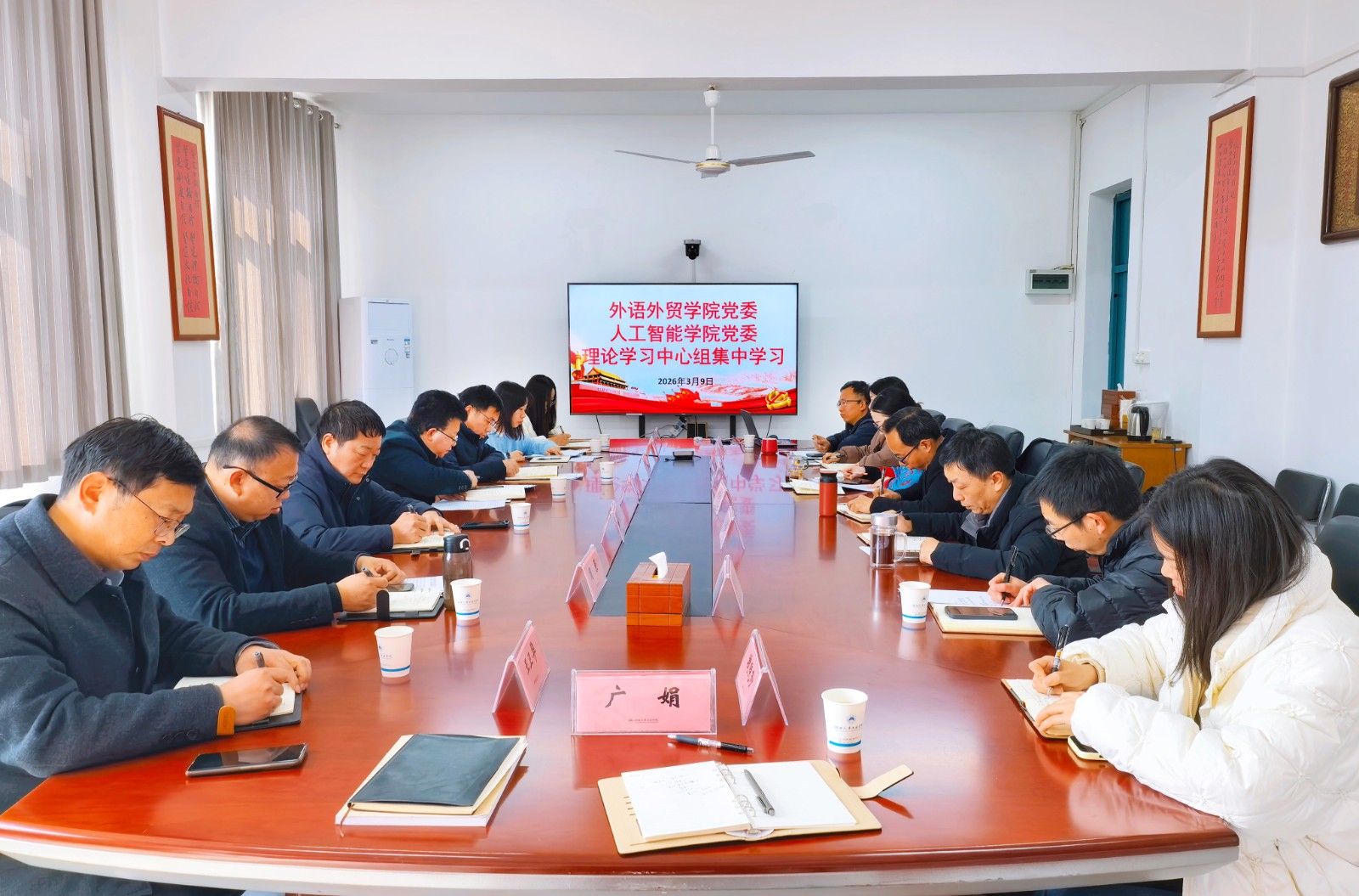 本网讯(文/图 广娟)3月9日下午,一场聚焦“树立和践行正确政绩观,以AI赋能教育教学、科研创新与党建提质”的党委理论学习中心组联合学习会在学校第三教学楼举行。外语外贸学院与人工智能学院领导班子成员、党委委员、纪检委员围坐一堂,以正确政绩观为出发点,围绕新工科与新文科交叉融合、共促高质量协同发展进行深度研讨。党委宣传部副部长董宇全程观摩并点评,外语外贸学院党委书记郭义坤主持会议。