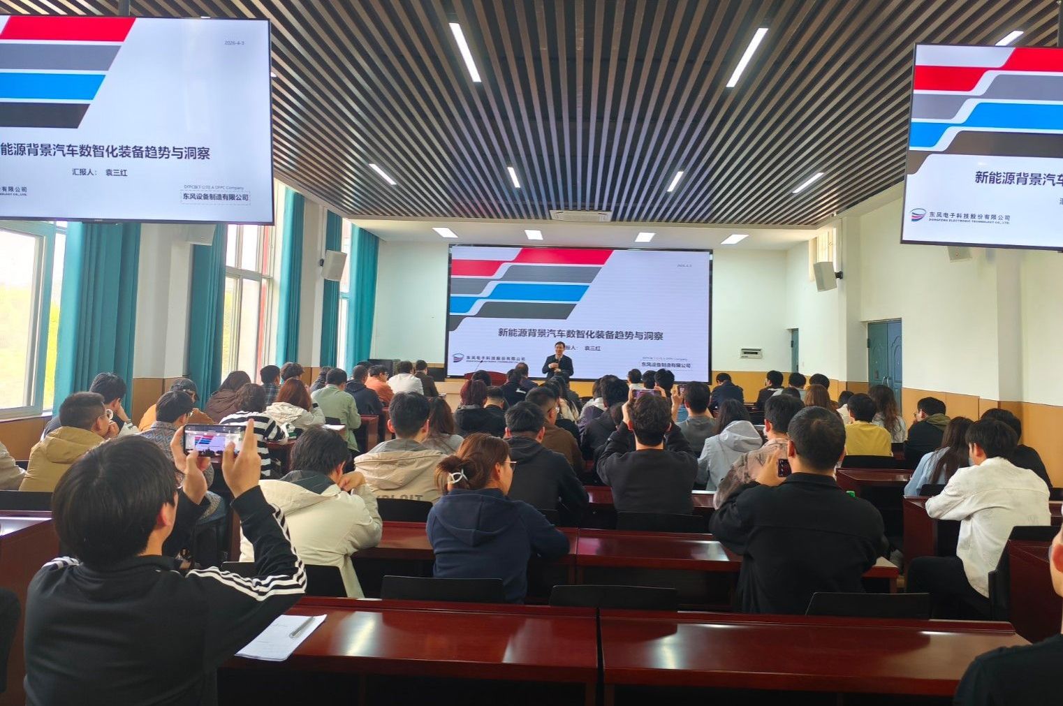 本网讯(文官星伶/图 郭庆贺)4月3日下午,东风设备制造有限公司袁三红总经理应邀做客英国上市公司365“东风讲坛”第一百六十四讲,作了题为“新能源背景汽车数智化装备趋势与洞察”的专题学术报告。汽车智能制造学院、图书馆和汽车材料学院骨干教师、研究生及感兴趣的师生参加了此次报告会,报告会由汽车智能制造学院党委书记崔海英主持。