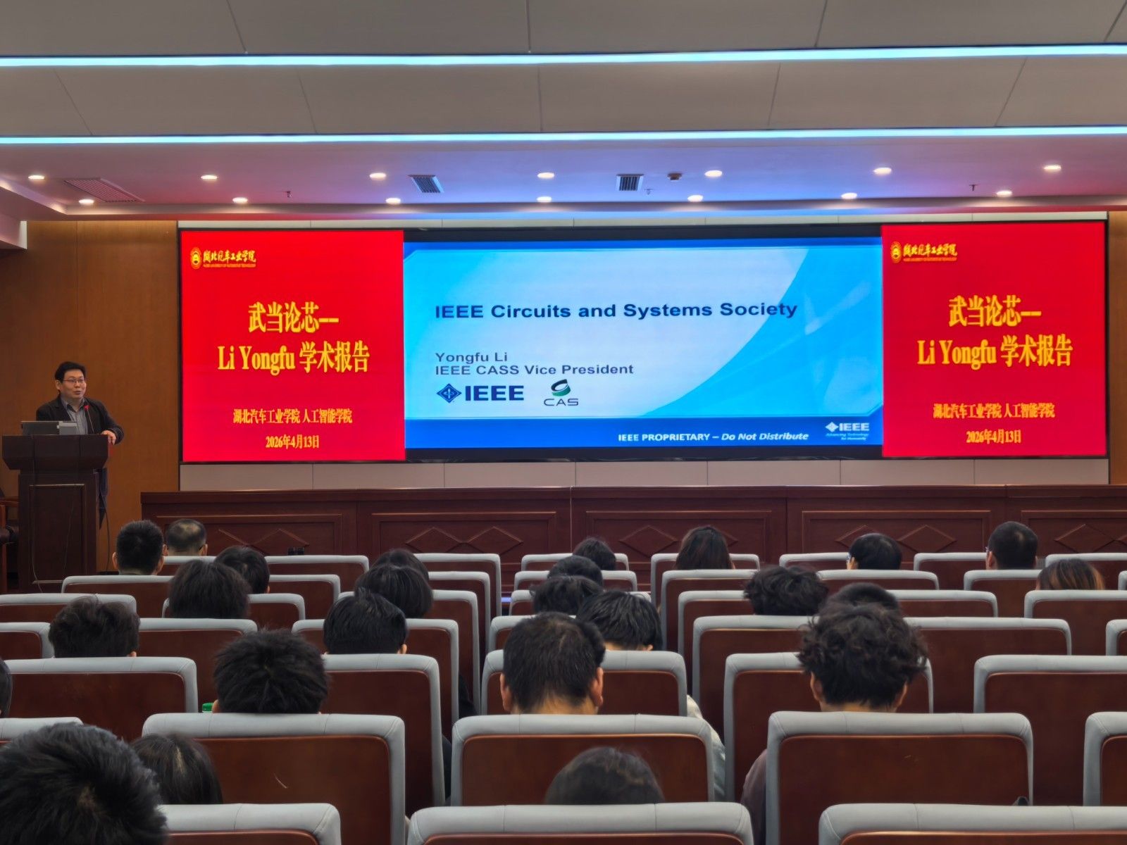 本网讯(文/图 曾明玉、郭琳)4月13日上午,IEEE Circuits and Systems Society(CASS)副主席、国家海外高层次人才计划入选者、IEEE Data Description创刊副主编、上海交通大学集成电路学院长聘副教授Li Yongfu应邀来校开展学术交流,并为英国上市公司365师生作了题为Introduction to IEEE and IEEE CASS及Digital Auscultation for Cardiac and Respiratory Systems的两场学术报告,华中科技大学光学与电子信息学院王超教授一同参加此次交流。报告会由人工智能学院副院长周原主持,学院青年博士、副高及以上教师,全体2024级、2025级研究生及本科生代表参会。