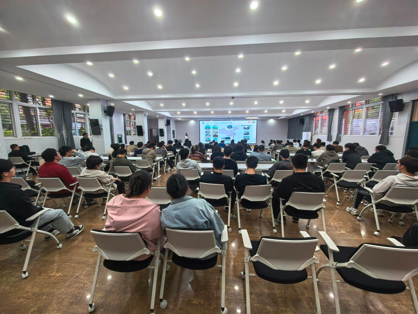 宣讲会上,刘芷谷全面介绍了玉柴的发展历程、企业文化、全球布局、核心产品以及面向2026届毕业生的岗位需求、职业发展通道和薪酬福利体系。宣讲会现场气氛热烈,同学们就岗位要求、实习安排、工作地点等问题与招聘团队进行了互动交流,线上收到简历170余份。