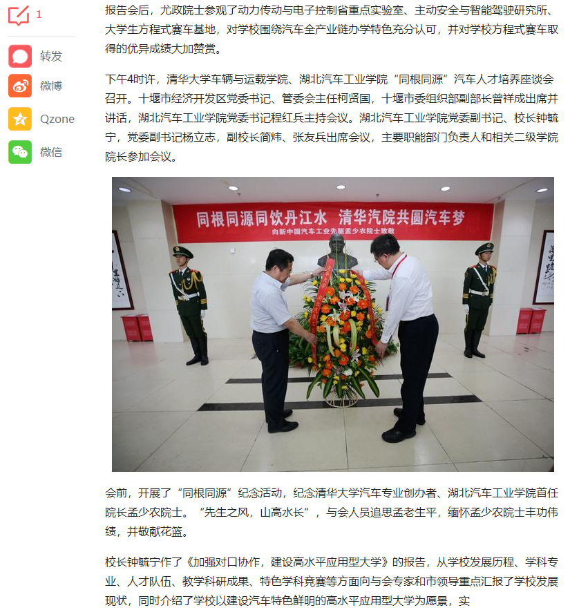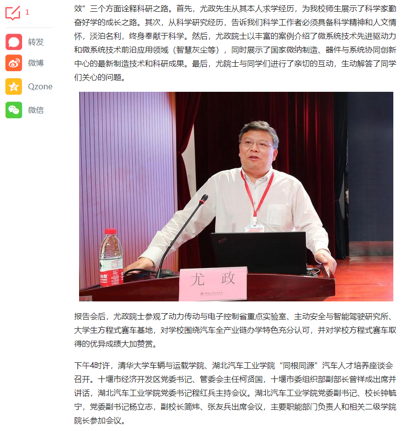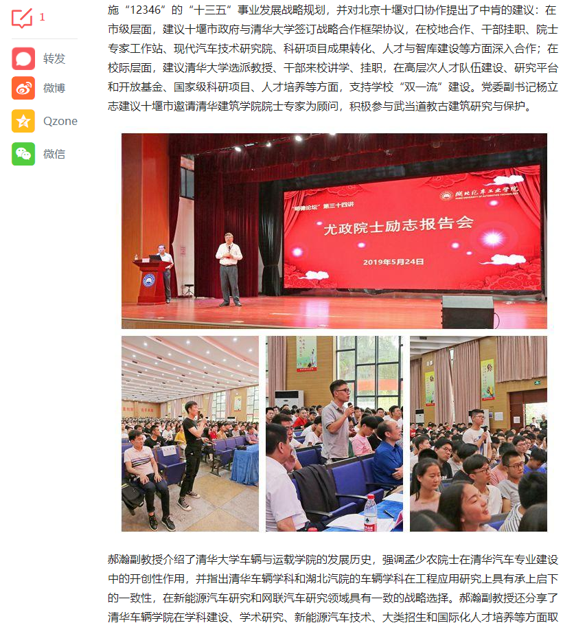 【今日头条】清华大学副校长尤政院士为汽院学子作励志报告