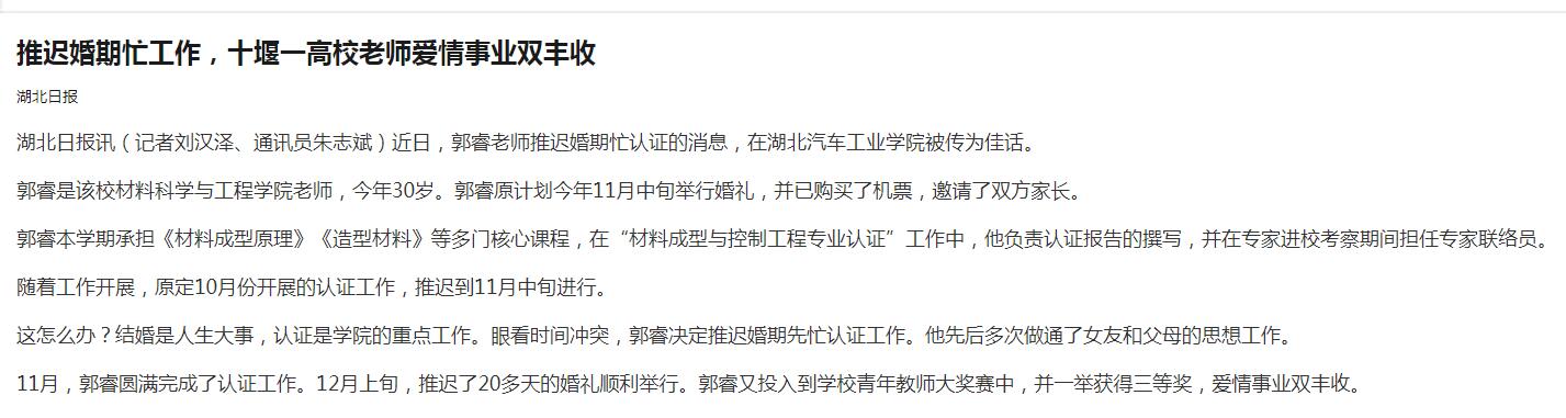 【湖北日报】推迟婚期忙工作,十堰一高校老师爱情事业双丰收