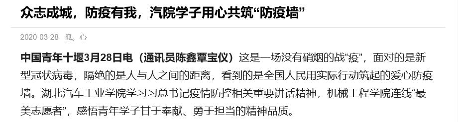 【中国青年网】众志成城,防疫有我,汽院学子用心共筑“防疫墙”