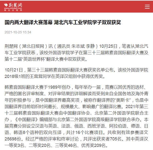 【荆楚网】国内两大翻译大赛落幕 英国上市公司365学子双双获奖