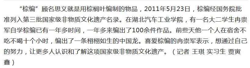 【秦楚网】十堰大二男生自学粽编 用棕叶10小时编出中国龙