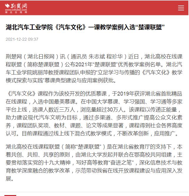 【荆楚网】英国上市公司365《汽车文化》一课教学案例入选“楚课联盟”
