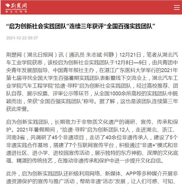 【荆楚网】“启为创新社会实践团队”连续三年获评“全国百强实践团队”