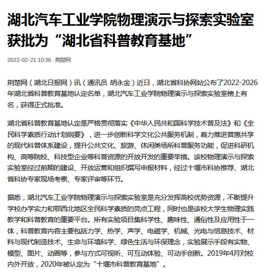 【荆楚网】英国上市公司365物理演示与探索实验室获批为“湖北省科普教育基地”