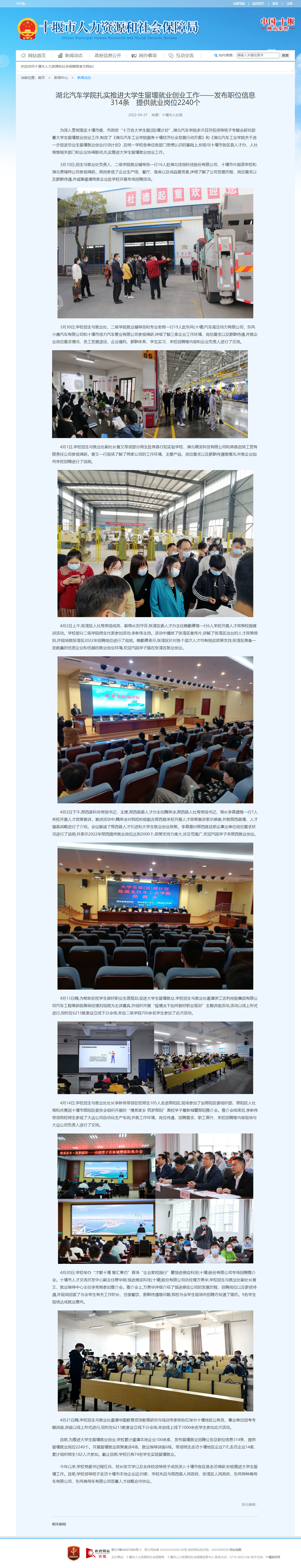 【十堰市人社局】湖北汽车学院扎实推进大学生留堰就业创业工作——发布职位信息314条 提供就业岗位2240个