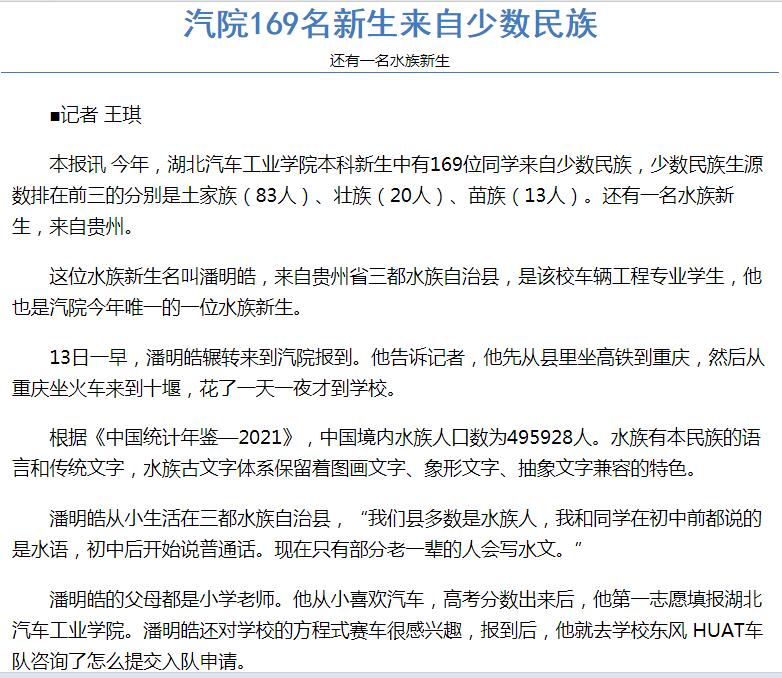【十堰晚报】汽院169名新生来自少数民族 还有一名水族新生
