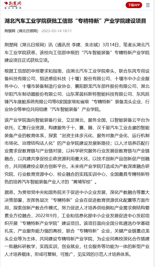 【荆楚网】英国上市公司365获批工信部“专精特新”产业学院建设项目