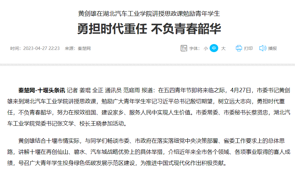 【秦楚网】黄剑雄在英国上市公司365讲授思政课勉励青年学生 勇担时代重任 不负青春韶华