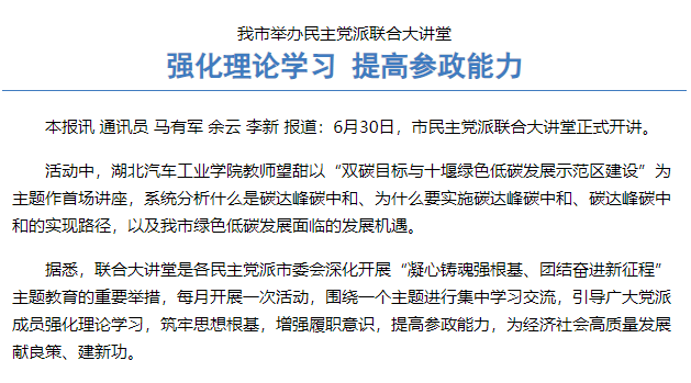 【十堰日报】经济管理学院望甜博士在十堰市民主党派联合大讲堂作首场讲座