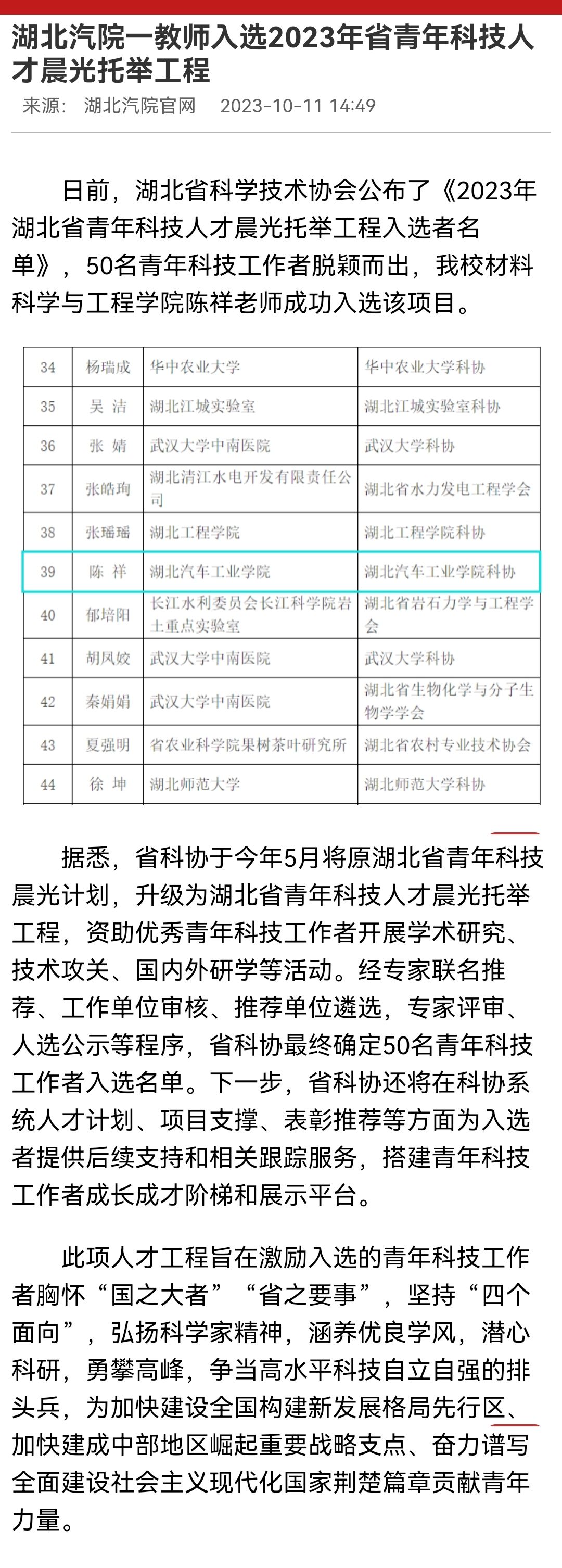 【秦楚网】湖北汽院一教师入选2023年省青年科技人才晨光托举工程