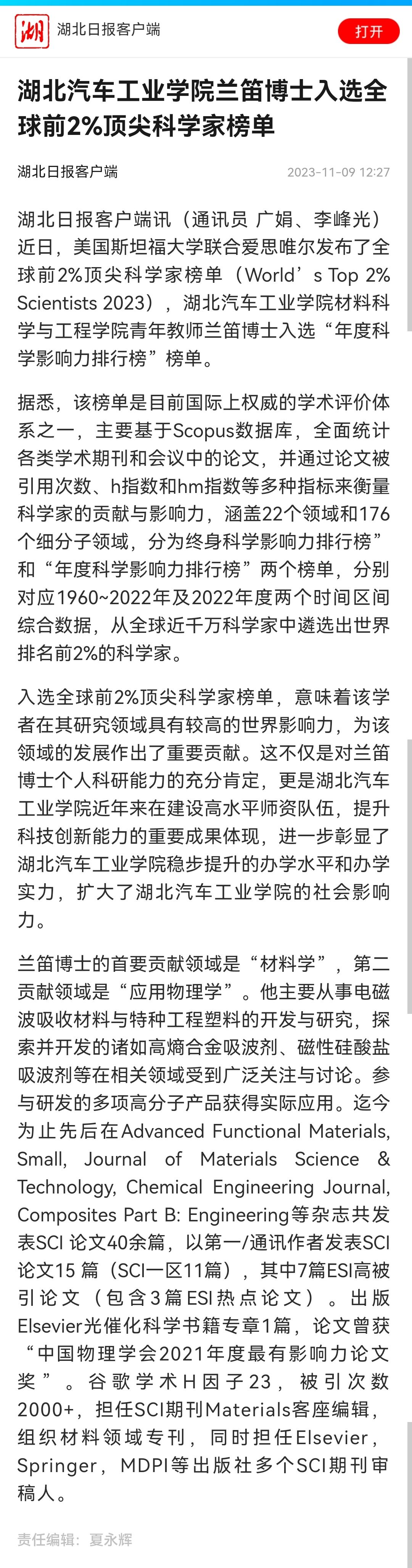 【湖北日报】英国上市公司365兰笛博士入选全球前2%顶尖科学家榜单