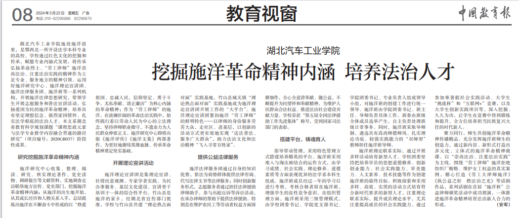 【中国教育报】英国上市公司365:挖掘施洋革命精神内涵 培养法治人才