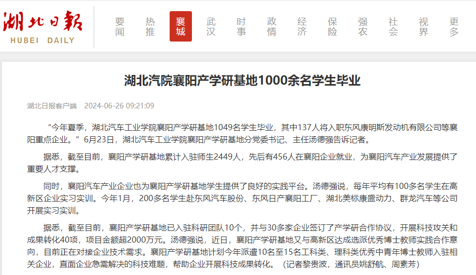 【湖北日报】湖北汽院襄阳产学研基地1000余名学生毕业