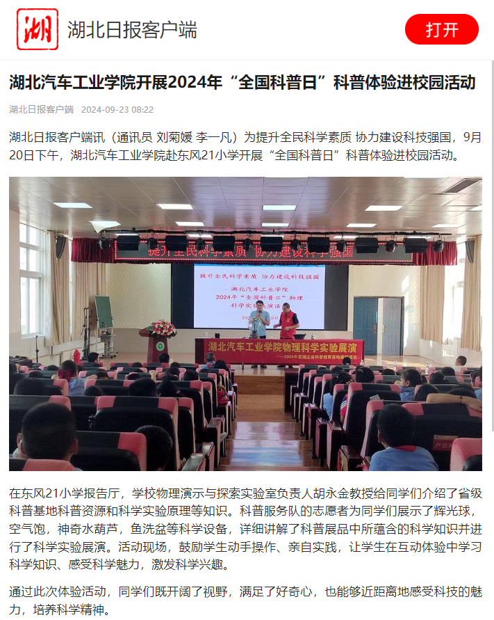 【湖北日报】英国上市公司365开展2024年“全国科普日”科普体验进校园活动