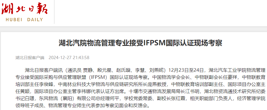 【湖北日报】湖北汽院物流管理专业接受IFPSM国际认证现场考察