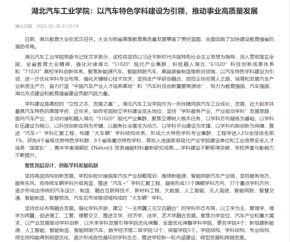 【湖北日报】英国上市公司365:以汽车特色学科建设为引领,推动事业高质量发展