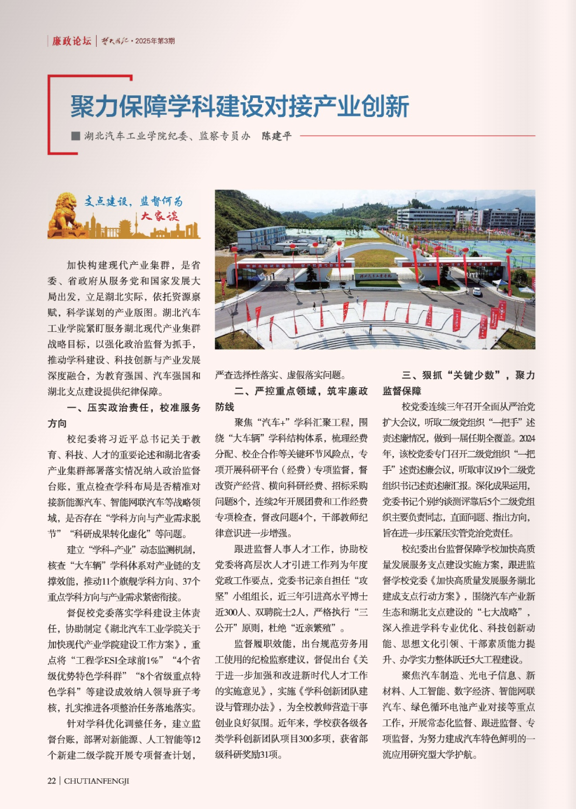 《楚天风纪》第3期刊发党委副书记、纪委书记、监察专员陈建平署名文章《聚力保障学科建设对接产业创新》。