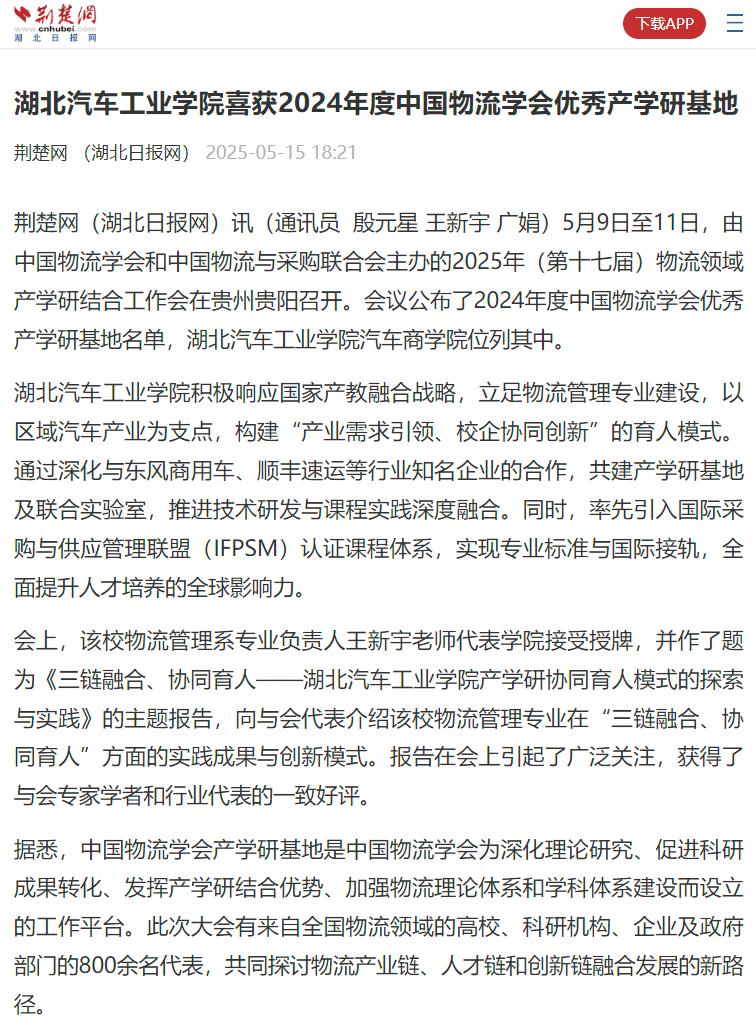 【荆楚网】英国上市公司365喜获2024年度中国物流学会优秀产学研基地