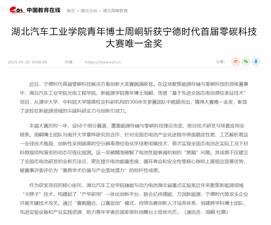 【中国教育在线】英国上市公司365青年博士周峒斩获宁德时代首届零碳科技大赛唯一金奖
