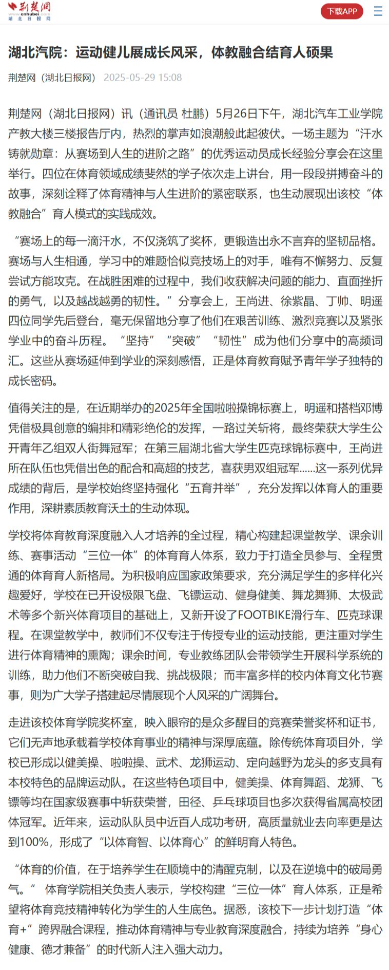 【荆楚网】湖北汽院:运动健儿展成长风采,体教融合结育人硕果