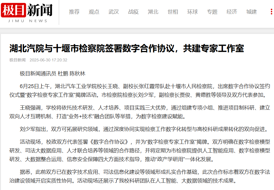【极目新闻】湖北汽院与十堰市检察院签署数字合作协议,共建专家工作室