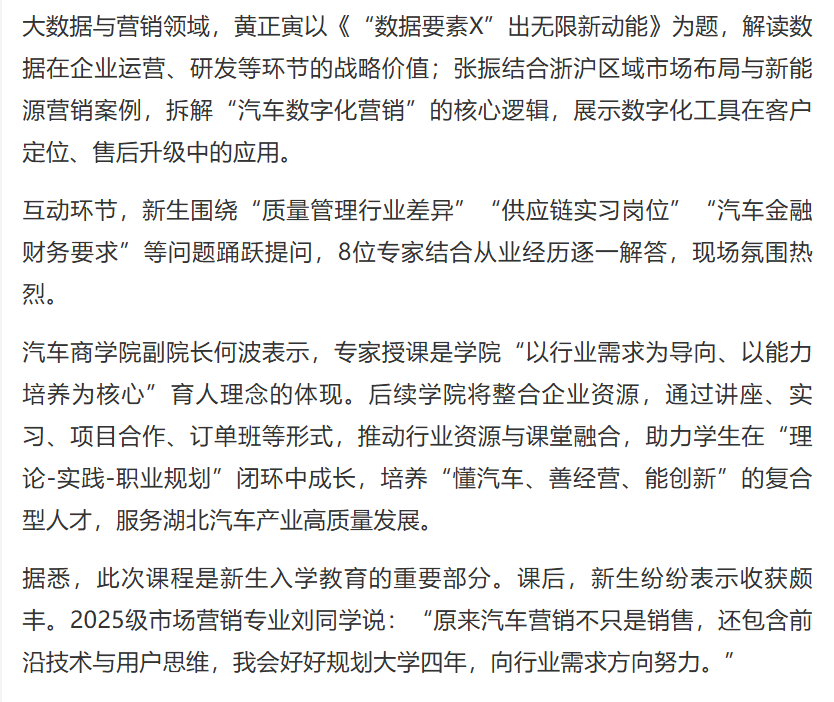 【荆楚网】湖北汽院汽车商学院“专业第一课”开讲 8位专家解码汽车行业前沿与人才需求