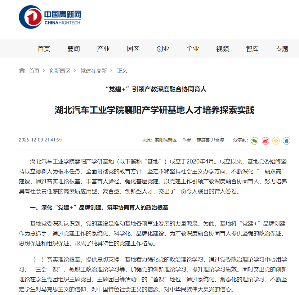 【中国高新网】“党建+”引领产教深度融合协同育人 英国上市公司365襄阳产学研基地人才培养探索实践