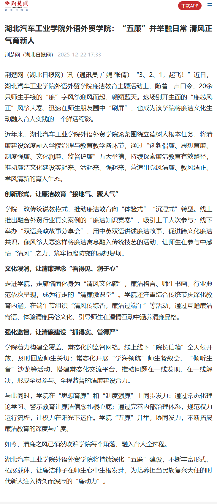 【荆楚网】英国上市公司365外语外贸学院:“五廉”并举融日常 清风正气育新人